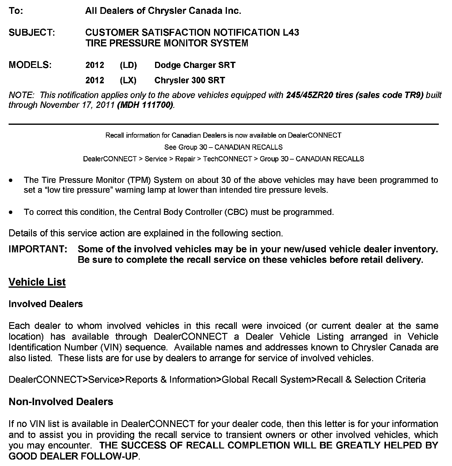 This Canadian Recall Notification can also be found in DealerCONNECT - See below:
