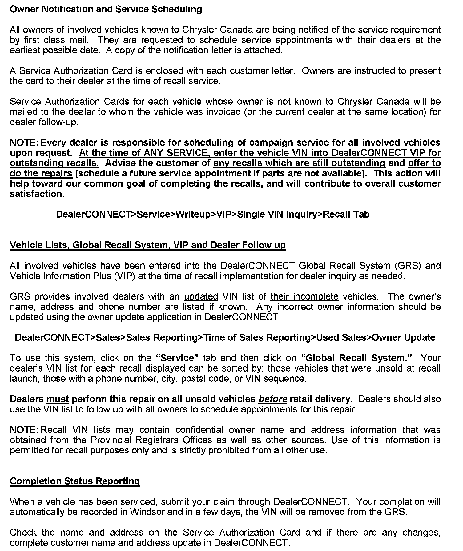 GRS has been developed to provide dealers with an up-to-date list of involved vehicles by recall number and by dealer code. Owners known to Chrysler are also listed. Involved vehicles will be removed from the GRS within several days of submitting repair claims.