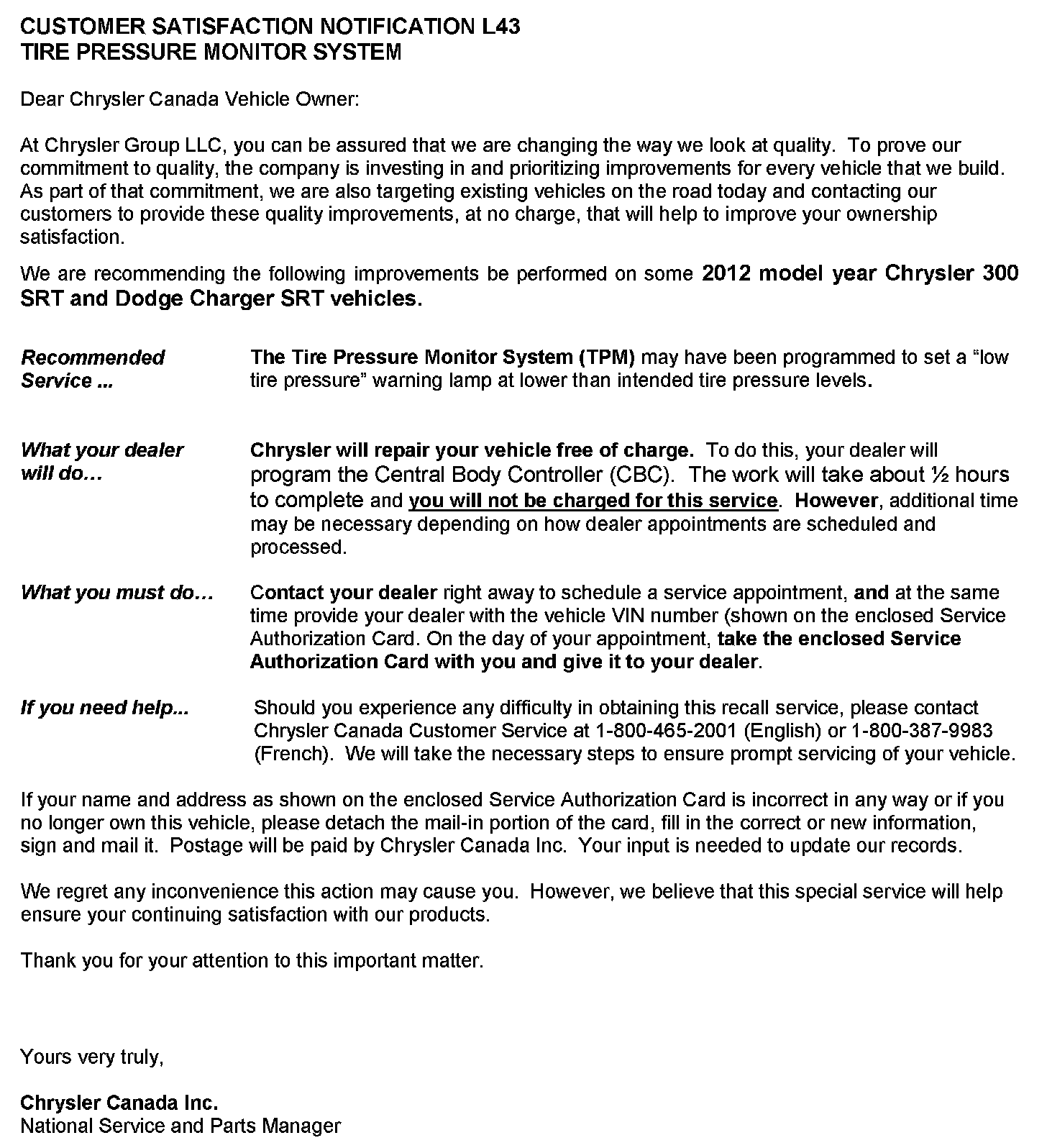 CUSTOMER SATISFACTION NOTIFICATION L43 TIRE PRESSURE MONITOR SYSTEM