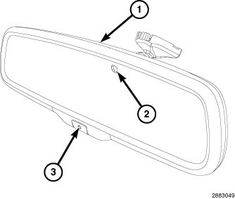 An automatic dimming inside rear view mirror (1) is an available option. The automatic lighted dimming mirror switch (3) allows the driver a manual control of whether the automatic dimming feature is operational. This switch is a momentary push button switch located on the lower rearward-facing surface of the mirror housing. When ON is selected, the switch illuminates to indicate that the automatic dimming mirror is turned ON. When OFF is selected, the LED is extinguished. If the vehicle is equipped with an optional driver side automatic dimming outside rear view mirror, the operation of that mirror is controlled by the same switch and inputs as the inside rear view mirror.