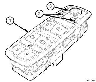 The power operated outside rear view mirrors are connected to battery current at all times. Each mirror head contains two electric motors, two drive mechanisms, an electric heating element and the mirror glass. First, a mirror selector switch button (2) is depressed in the driver door power switch module (1) to determine whether the mirror adjuster switch (3) will have control over the right or left mirror. If the vehicle is equipped with the high current door power switch module configuration, hard wired ground and battery current outputs to each power mirror motor determine whether the horizontal or the vertical motor will be operated and the polarity of those outputs control the direction in which the motor will move the drive unit and mirror glass.
