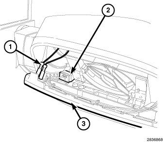4. If equipped, disconnect the blind spot indicator and heater wires (1) by pulling on thumb tabs.