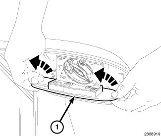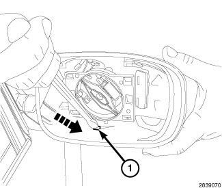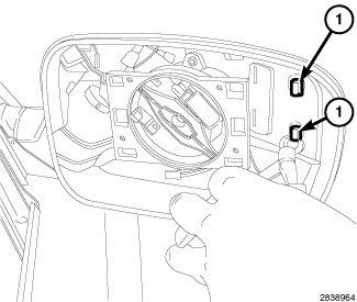 2. Using a flat head screw driver, pliers or equivalent, disengage the mirror cap outboard snaps (1).