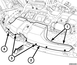 2. Remove the eight screws (3) that secure the front of the defroster duct (2) to the instrument panel cover (4).