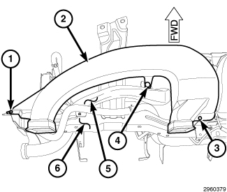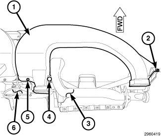 4. Remove the two screws (1 and 3) that secure the left side instrument panel duct to the instrument panel support (6) and remove the duct.