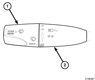 The vehicle operator initiates all wiper and washer system functions with the control knob (1) on the control stalk (2) of the multi-function switch that extends from the left side of the steering column, just below the steering wheel. Rotating the control knob on the end of the control stalk, selects the OFF, DELAY (except with the optional automatic wiper system), AUTO (with the optional automatic wiper system only), LOW or HIGH wiper system operating modes. In the DELAY mode, the control knob also allows the vehicle operator to select from one of four intermittent wipe DELAY intervals. In the AUTO mode, the control knob allows the vehicle operator to select from one of four automatic wiper sensitivity levels.