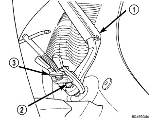 1. Lift the wiper arm and blade (3) to its over-center position to hold the wiper blade off of the glass and relieve the spring tension on the wiper arm to pivot shaft connection.