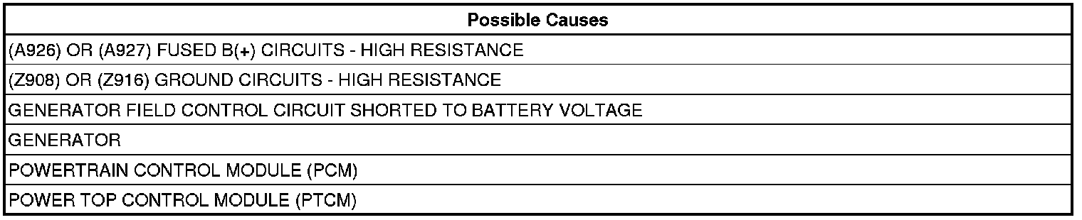 NOTE: If charging system voltage readings are acceptable on both the scan tool and at the (A926) or (A927) Fused (B+) circuit at the Power Top Control Module and no other modules are reporting this DTC then replacing the Power Top Control Module is the most likely course of action.