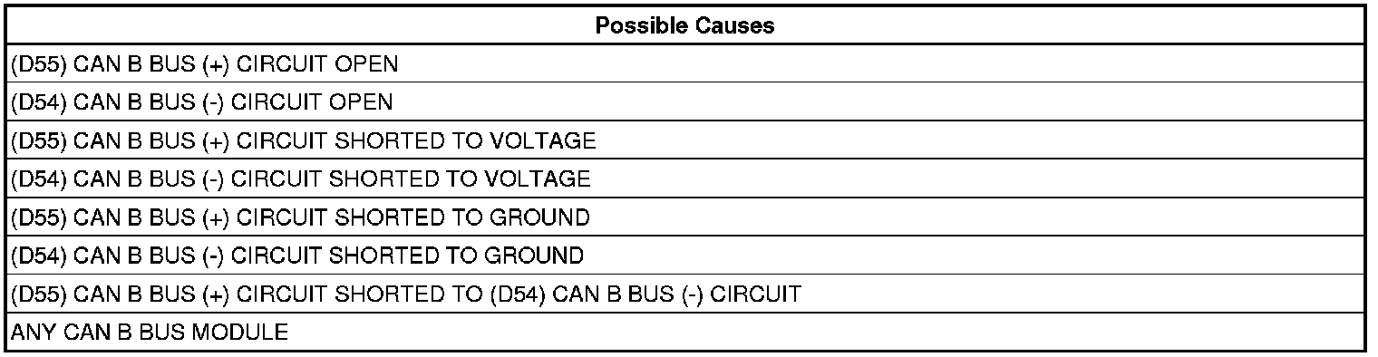 - Disconnect each CAN B Bus module one at a time while observing the voltage to determine if the short is caused by an internal short within a module. Replace the module,, that when disconnected eliminates the short to voltage. If the short condition is still present with all CAN B Bus modules disconnected use the Wiring Diagrams to help isolate and repair the (D54) CAN B Bus (-) circuit for a short to voltage.