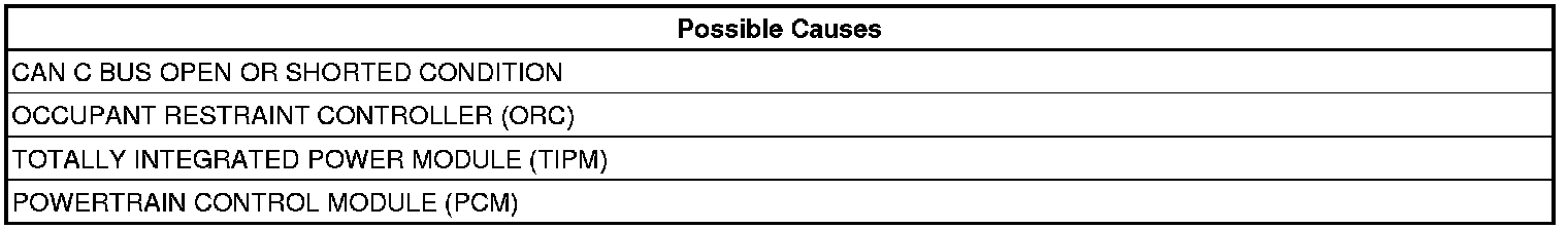 The Powertrain Control Module (PCM) doesn't receive an Occupant Restraint Controller (ORC) message over the CAN C circuit for seven consecutive seconds. The circuit is continuously monitored.