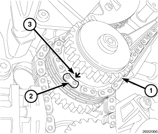 27. Drape the right side cam chain over the right side exhaust cam phaser and onto the idler sprocket (1) so that the dimple (2) is aligned with the plated link (3) on the cam chain.