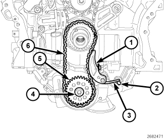 15. While maintaining this alignment, lubricate the idler sprocket bushing with clean engine oil and install the sprockets and timing chain on the engine. To verify that the timing is still correct, the timing chain plated link (6) should be located at 12:00 (1) when the dimple (5) on the crankshaft is aligned with the block/bearing cap junction (4).