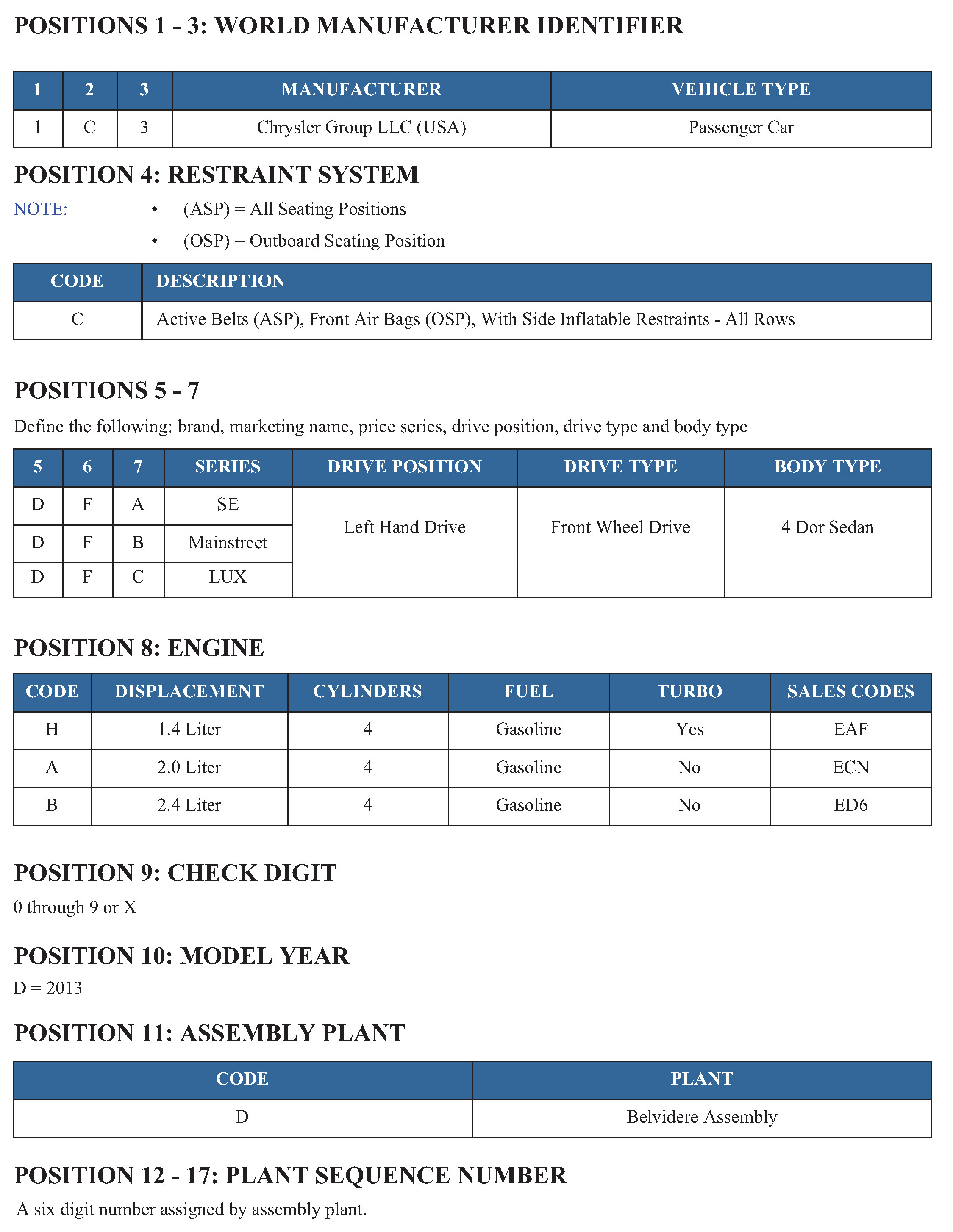 The Vehicle Identification Number (VIN) can be viewed through the windshield at the upper left corner of the instrument panel, near the left windshield pillar. The VIN consists of 17 characters in a combination of letters and numbers that provide specific information about the vehicle. Refer to the charts below for decoding information.