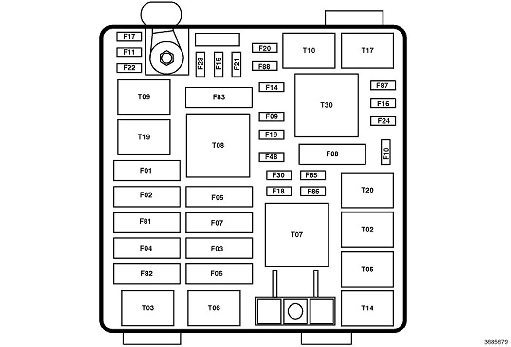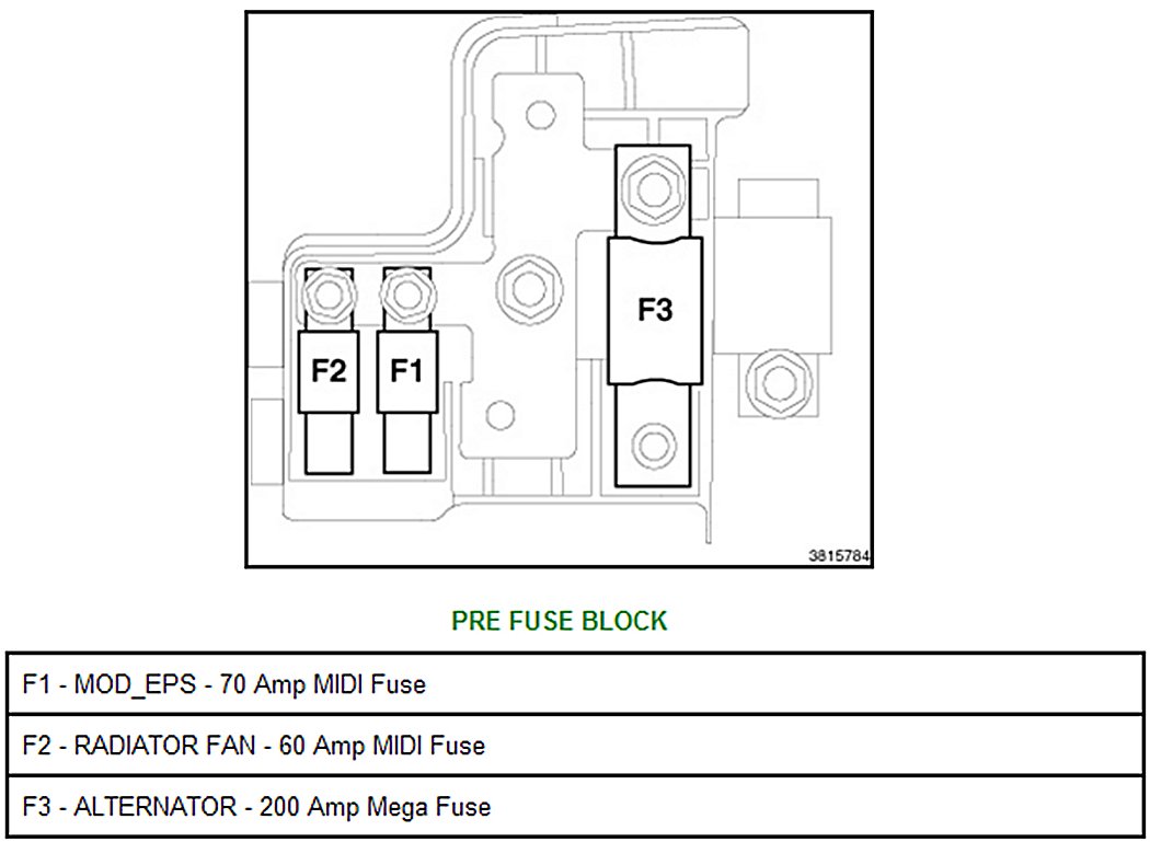 A Pre Fuse Block is located in the engine compartment on top of the battery. This fuse block contains MIDI and MEGA fuses.