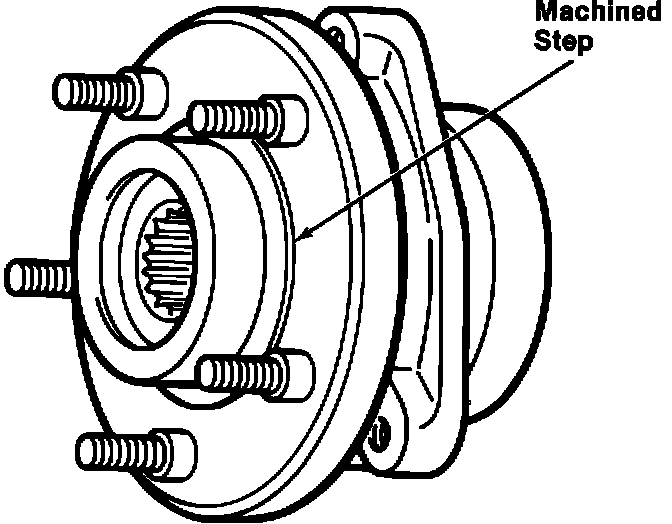 Inspect both front wheel hubs at the rotor mounting flange surface (inboard of the five mounting holes) for a machined step about halfway around the flange (Fig. 1). If the step is present, replace the original hub and bearing assemblies with replacement assembly, 3238527. Refer to the hub and bearing removal and installation procedures on pages 2F-22 and 2F-23 in the 1982 AMC Technical Service Manual.