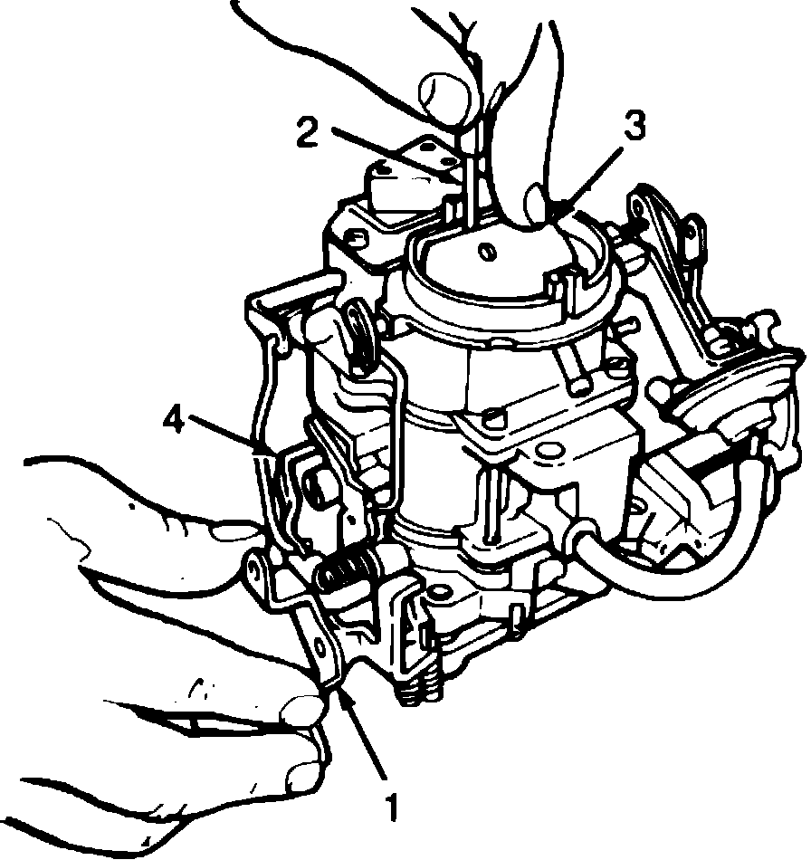 1. Hold throttle valve in wide open position, (1) Fig. 4. Insert the specified drill (2) size between upper edge of choke valve and inner wall of air horn (3).