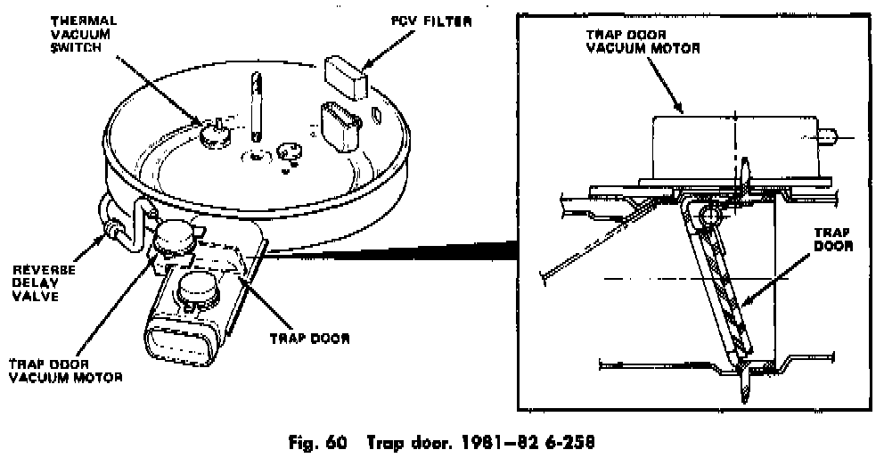 On 6-258 engines, the air cleaner has a spring-loaded trap door, Fig. 60, that closes off the air cleaner and carburetor when the engine is off. This door is actuated by a vacuum motor. When the engine is started, intake manifold vacuum opens the door allowing air to enter the air cleaner. A reverse delay valve is also used to prevent the trap door from closing during low vacuum level operation (such as during acceleration). The valve also functions to prevent abrupt closings of the trap door when the engine is turned off by gradually allowing atmospheric pressure to enter the vacuum motor.
