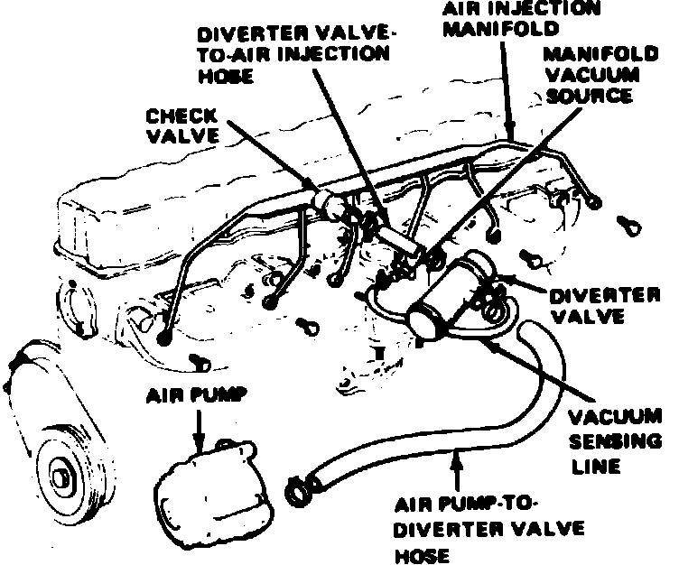 This system, Fig. 1 reduces the level of unburned hydrocarbons (HC) and carbon monoxide (CO) emissions by injecting secondary air from an air pump into the exhaust manifolds.