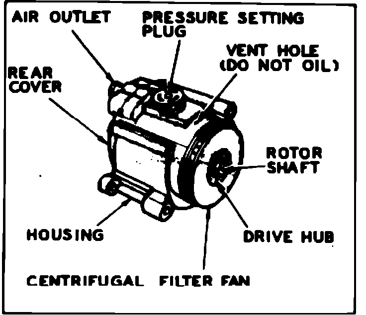The air pump is a positive displacement unit that requires no maintenance, Figs. 2 and 3. The early units incorporated a replaceable element type air filter and pressure relief valve. Later units incorporate only a replaceable centrifugal type air filter. The pressure relief valve on early units is located in the exhaust cavity and encloses a preloaded spring, a seat and pressure setting plug.