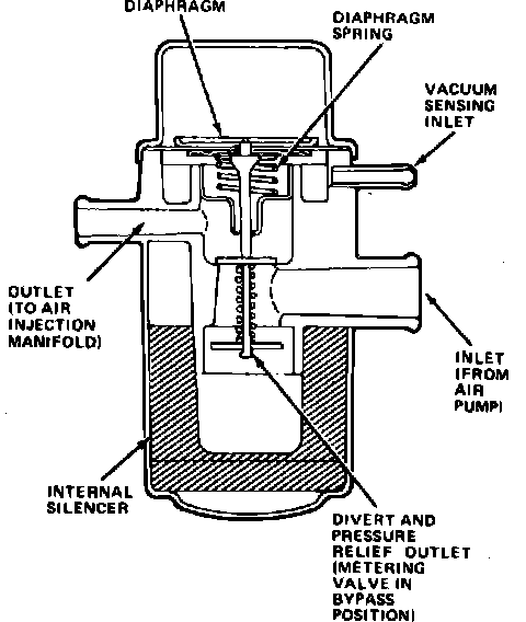 The bypass valve used on some engines, is in the normally closed position to allow pump air to flow freely through the valve fittings and into the exhaust manifold. When the throttle is closed quickly and engine manifold vacuum rises, the sudden increase in vacuum (sensed through a vacuum connection at the carburetor base) overcomes the diaphragm spring tension and momentarily moves the valve to the open position. When the valve is in the open position, pump air flow is bypassed to atmosphere or ``dumped'' through a bronze silencer pressed into the outlet opening. This action is required to prevent a backfire in the exhaust system which could occur when the throttle is closed suddenly. This valve is operating normally when no exhaust system backfire occurs during rapid throttle closure.