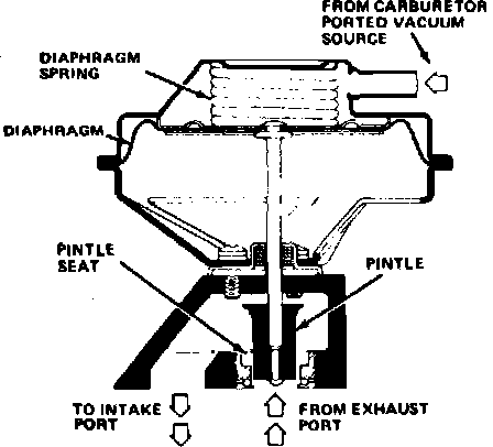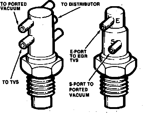 The EGR valve without an exhaust back pressure sensor, Fig. 22, is normally held closed by a spring located above the diaphragm. The valve opens when enough vacuum is applied through the hoses connecting the coolant temperature override (CTO) switch, Fig. 23, to the EGR vacuum port at the carburetor. When vacuum overcomes the spring tension, a pintle within the valve is lifted off its seat and exhaust gas is metered into the intake manifold.