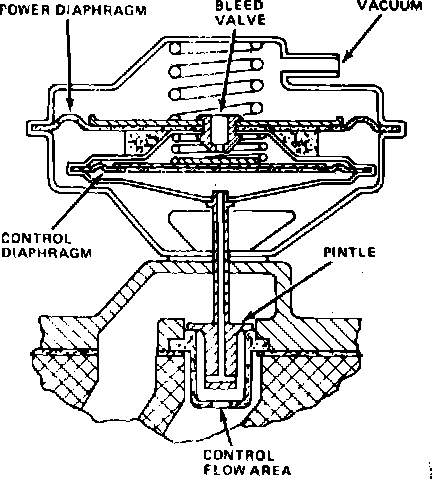 The EGR valve with an integral exhaust back pressure sensor, Fig. 24, combines the functions of the EGR valve and separate back pressure sensor into a single unit. This unit is calibrated by the use of selective diaphragm spring loads and flow control orifices. The exhaust gas flow is controlled by a moveable pintle. When no vacuum is applied to the diaphragm, the pintle is held against its seat by spring tension, confining exhaust gases to the exhaust manifold. When vacuum is applied to the diaphragm, the pintle is forced from its seat, however, this cannot occur if the vacuum bleed valve in the power diaphragm is opened. Exhaust gas back pressure from inside the exhaust manifold flows through the hollow pintle stem into the control diaphragm chamber. If this pressure is enough to overcome the control spring tension, the control diaphragm moves against its bleed valve. Full vacuum is now applied to the power diaphragm and the pintle moves, allowing exhaust gas to flow to the intake manifold. If the exhaust back pressure drops enough, the control diaphragm moves away from the bleed valve and the pintle returns to its seat.