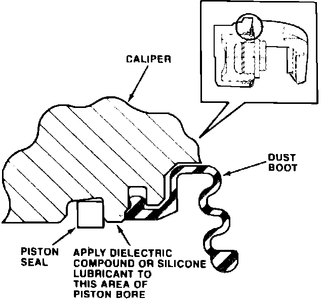 1. Coat square cut piston seal with clean brake fluid, then install seal into piston bore. Work seal into groove with clean fingers.