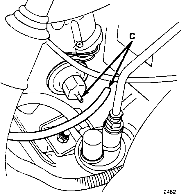 5. Disconnect and plug the distributor vacuum advance hose (C).