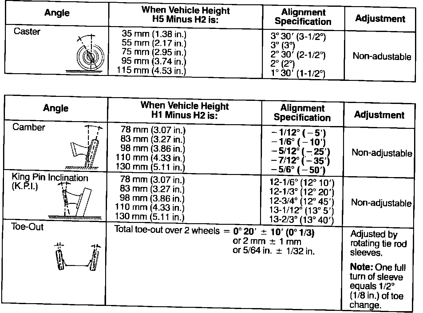 Note: Vehicle weight must be on all four tires before tightening suspension bushing bolts on such components as the control arms and stabilizer bars. In addition, vehicle height must be determined before checking front end alignment. Refer to the height measurement information on pages J-5 and J-6 of this manual. Record the vehicle heights measured and locate the height value closest to the actual alignment specification. The specifications shown for camber and K.P.I. are +/- 1/2~ side-to-side variation must not exceed 1~ for caster, camber or K.P.I.