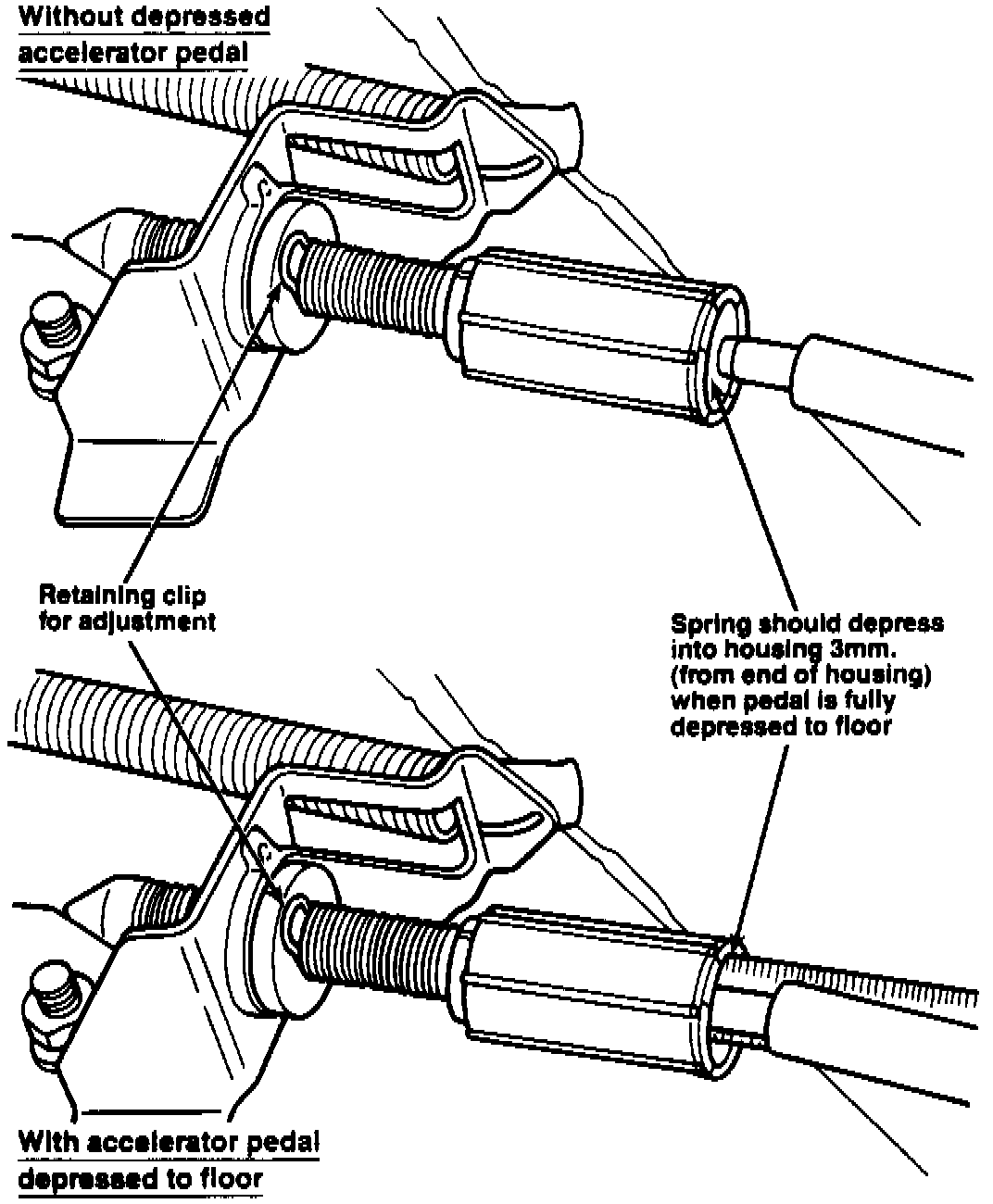 ^ With the accelerator pedal fully depressed to the floor, the spring should be compressed to 3 mm (approximately 3/32" to 1/8") from the edge of the spring housing (see illustrations).