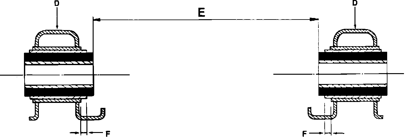 Install replacement bushings using a suitable press and the same bushing driver/receiver tools used during removal. The control arm bushing are not identical and should not be interchanged from one side to the next. Press the bushings (D), into the control arm equally and in small increments. Dimension (E) must be 7.48 inches plus or minus 0.019 inch. Dimension (F) must be the same at both bushing locations.