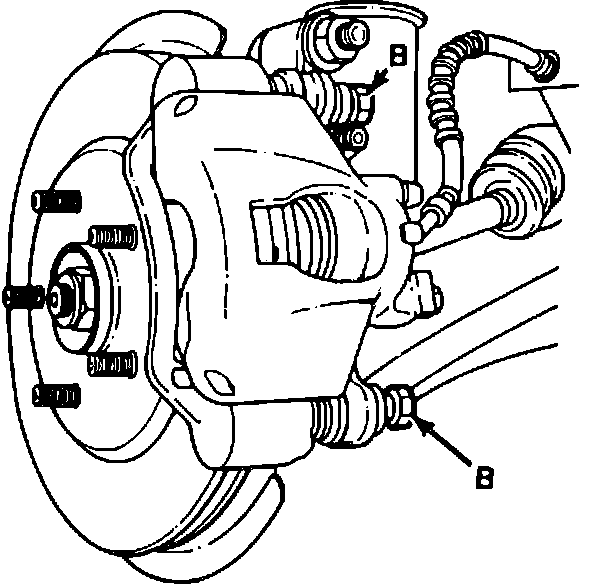5. Remove caliper mounting pins, then lift caliper from mounting bracket and off rotor. Suspend caliper with suitable wire to prevent damaging brake hose.