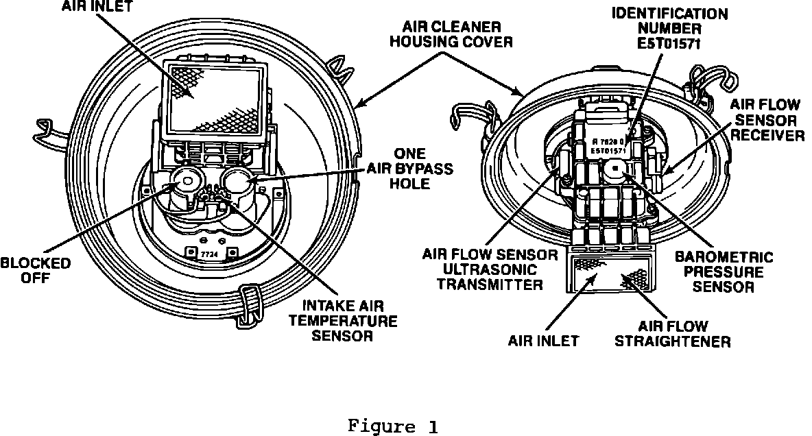 1. Confirm the air flow sensor identification number (E5TO1571) as marked on the side of the air flow sensor (Figure 1). Inspect the air passage of the sensor and verify that one of the air by-pass holes are plugged. If both of the by-pass holes are open, the air flow sensor must be replaced using the correct sensor, PN MD118125.