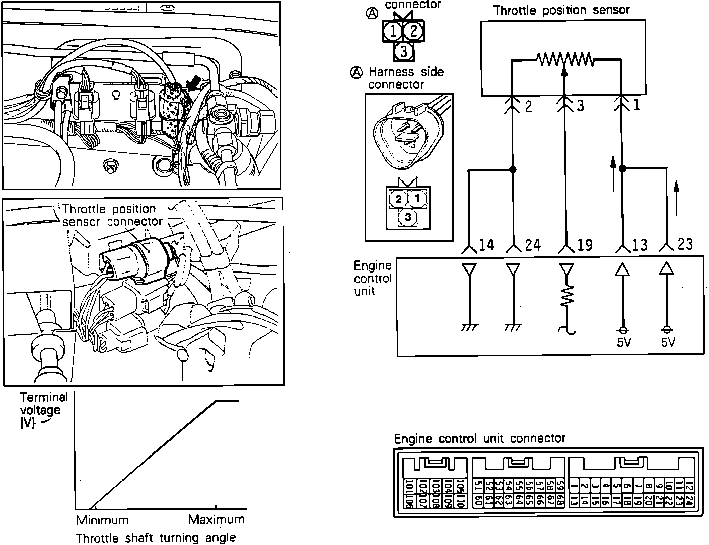 2. Using a high-impedance digital voltmeter, carefully back probe the throttle position connector into terminals 2 and 3. Refer to the connector in the image.