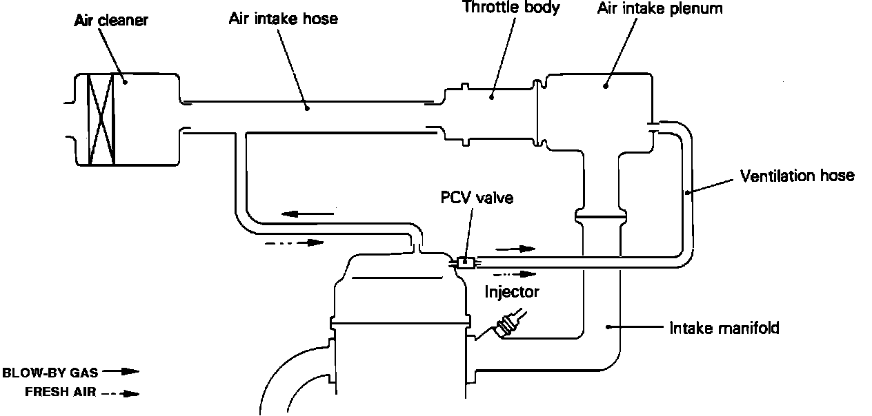 If an abnormal operating condition develops (PCV Valve stuck closed), the system is designed to allow excessive amounts of blow-by gases in the crankcase to back flow into the air cleaner to be consumed by normal combustion.