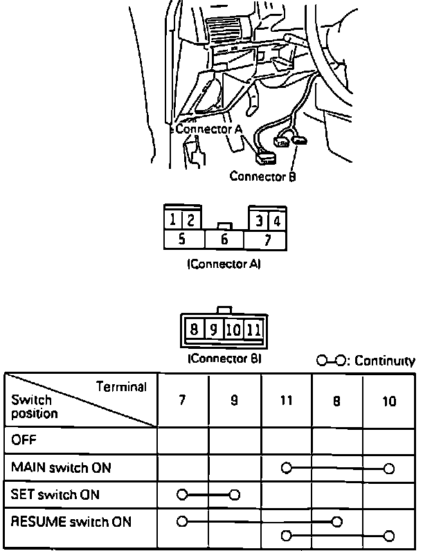 Gain access and disconnect connector to speed control main switch and check for continuity between terminals as shown.