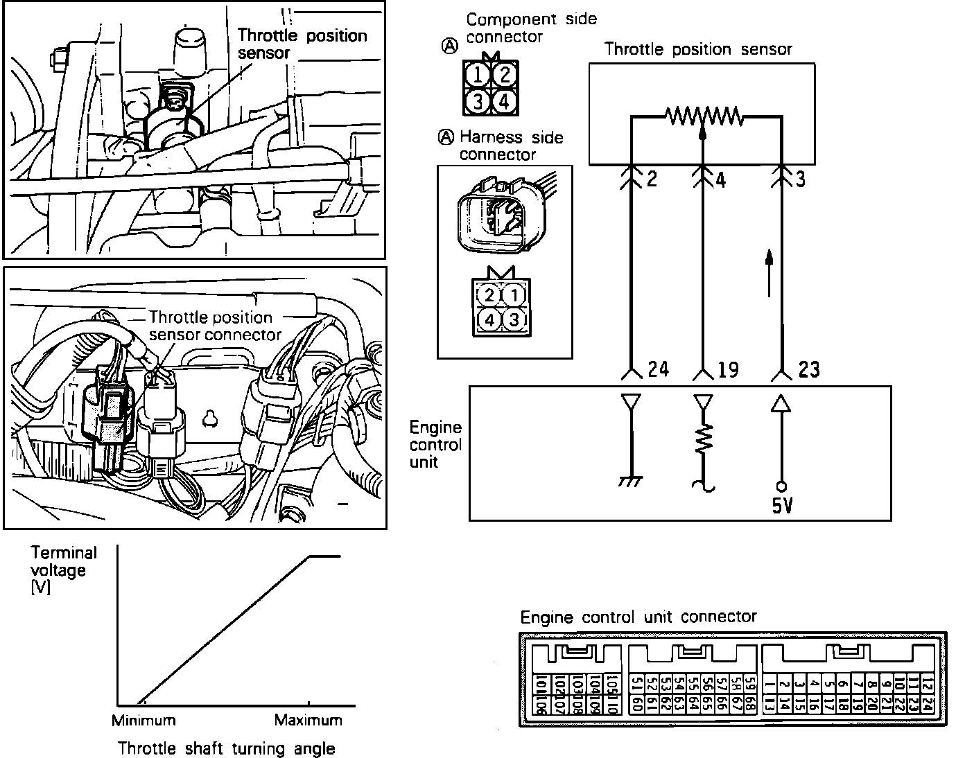 3. With the key on, engine off, check that the output voltage of the TPS is within 0.48-0.52 volts. If not, adjust the TPS by loosening the mounting screws and rotating the sensor.