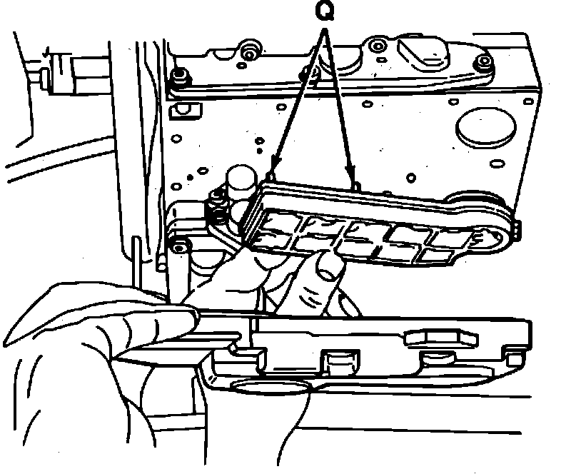 7. Install new O-ring on oil screen. Coat new oil screen cover gasket with petroleum jelly, then install on valve body. Install screen, pressing tabs (Q) into valve body as shown in Fig. 2.