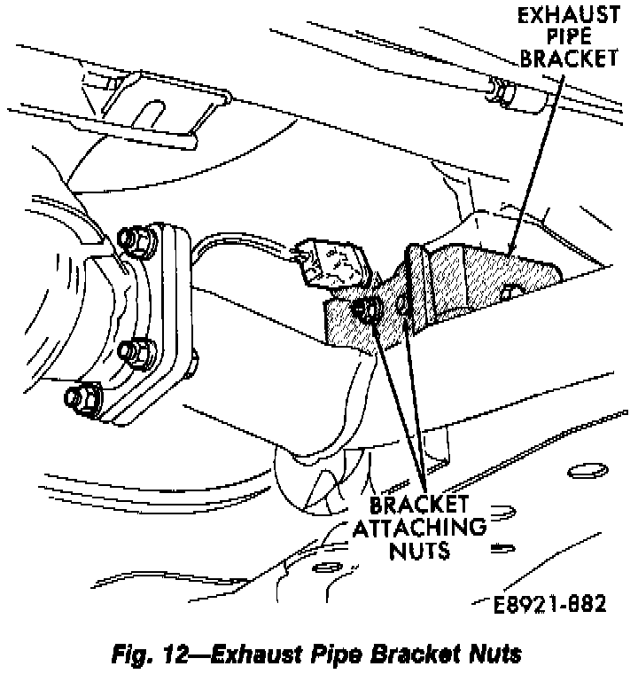 18. Remove bolts attaching exhaust pipe bracket to rear cushion.
