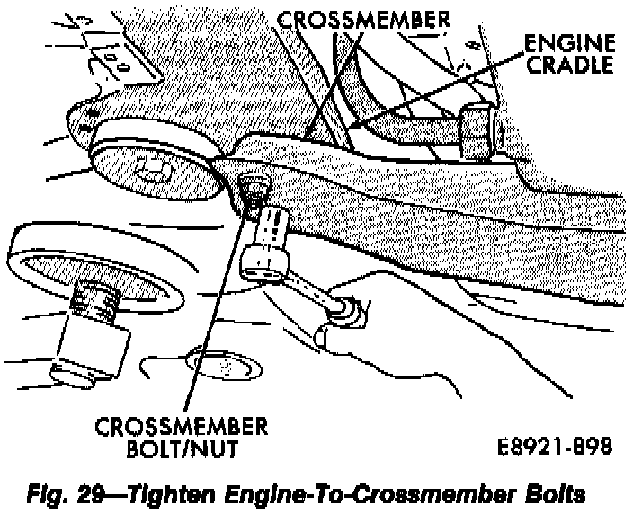 28. Install bolts and nuts attaching crossmember to studs on engine cradle. Tighten bolts/nuts to 60 N.m (44 ft-lbs) torque.
