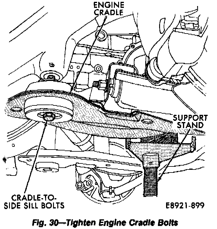 25. Lower engine cradle for working clearance. Loosen engine cradle bolts until there is 1/2 to 7/8 inch space between cradle and side sill. Do not remove bolts completely and do not lower cradle any more than specified.