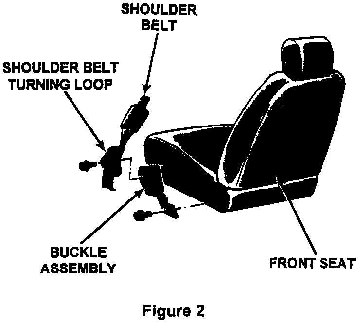 16. Install the right (passenger) side automatic shoulder belt turning loop onto the buckle assembly mounting bracket (Figure 2). Tighten the bolt to 100 in-lbs (11.5 N.m).