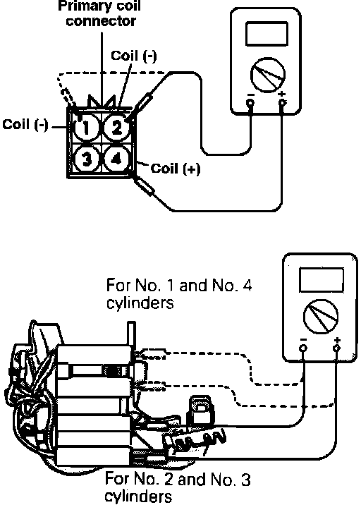 Disconnect the four wire coil connector and measure the resistance between the positive terminal and negative terminals of the ignition coils.