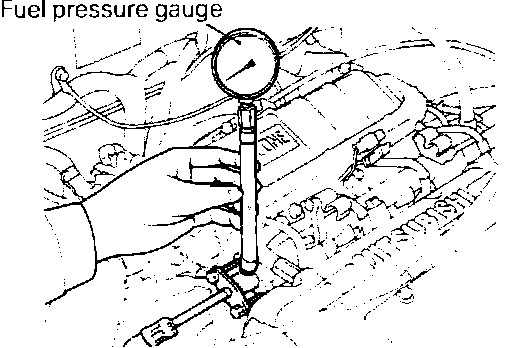 9. Stop the engine and check for a change in fuel pressure readings. Pressure should hold for 5 minutes. If the gauge reading drops, observe the rate of drop. Determine the cause according to the following symptoms.