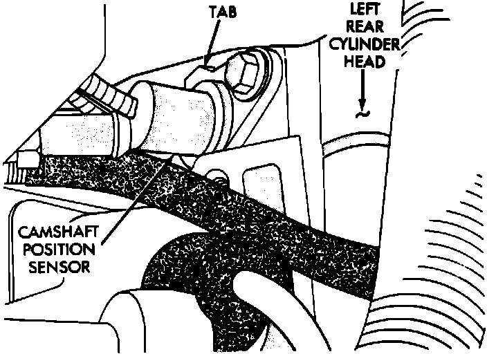 4. Install the sensor with the tab facing the rear of the engine.