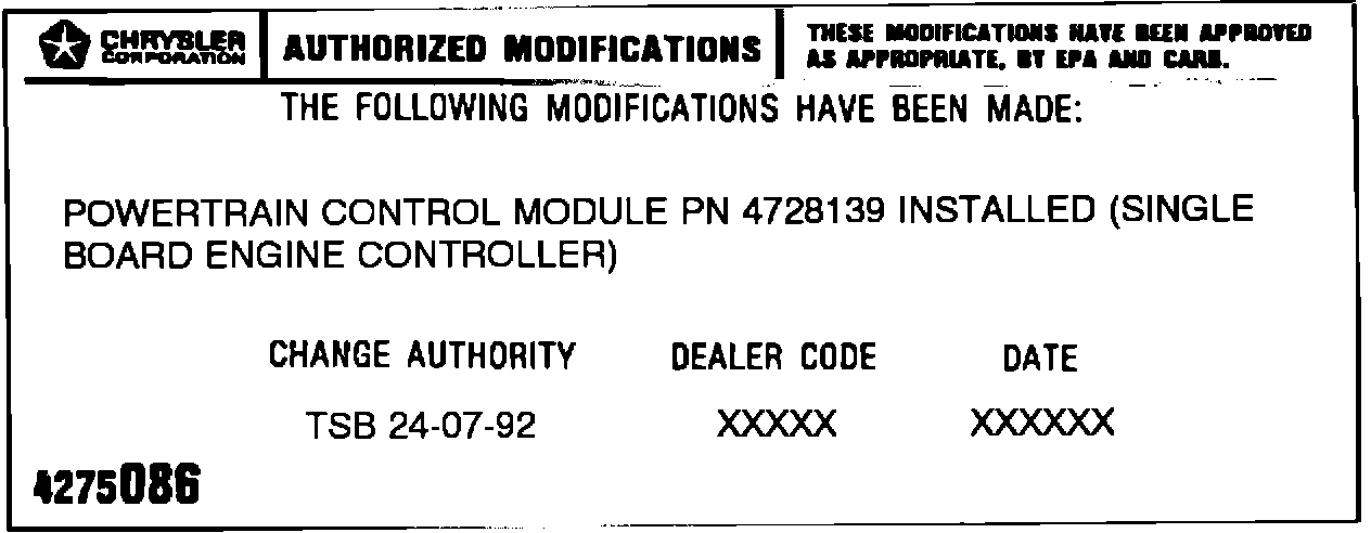 1. Replace the Powertrain Control Module (SBEC) with PN 4728139, as outlined in the Ignition System section (Group 8D) of the appropriate service manual.