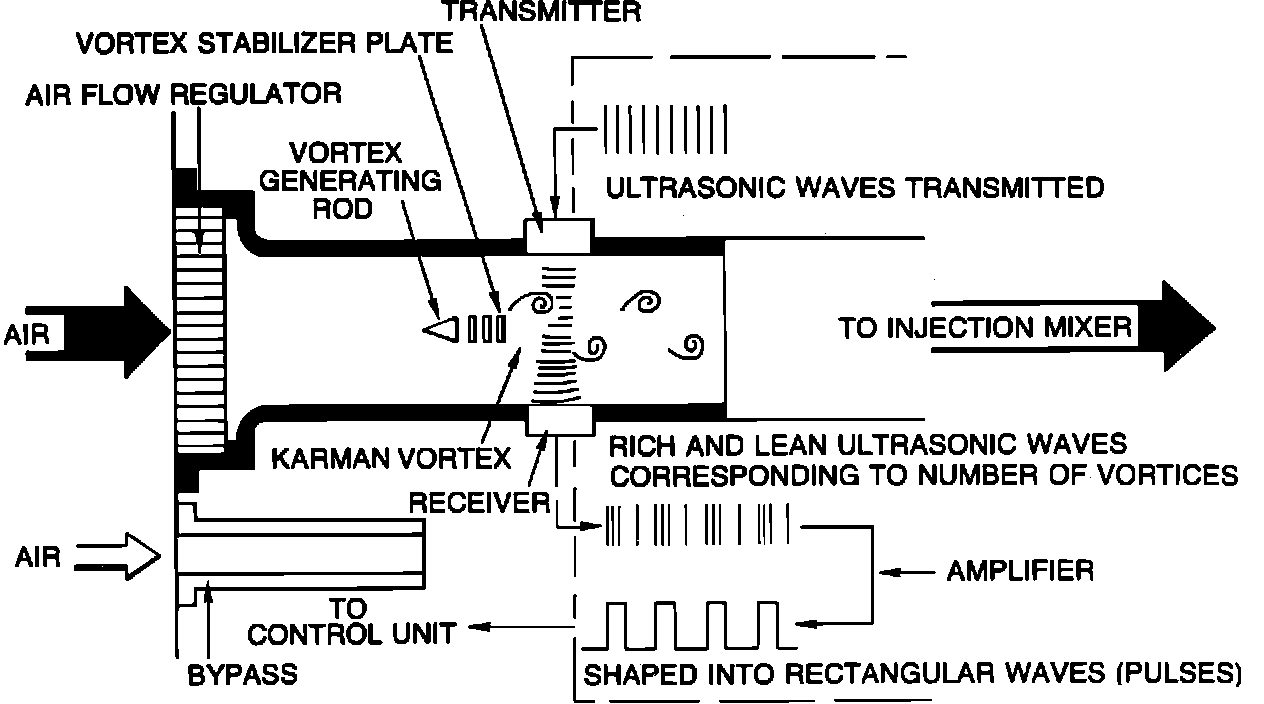 As air enters the intake stream, it strikes a vortex generating column and creates vortices that swirl clockwise and counterclockwise. As the increasing air flow passes between the transmitter and the receiver, the sound waves are interrupted by the vortices. This causes the sound waves to speed up, and then slow down alternately.