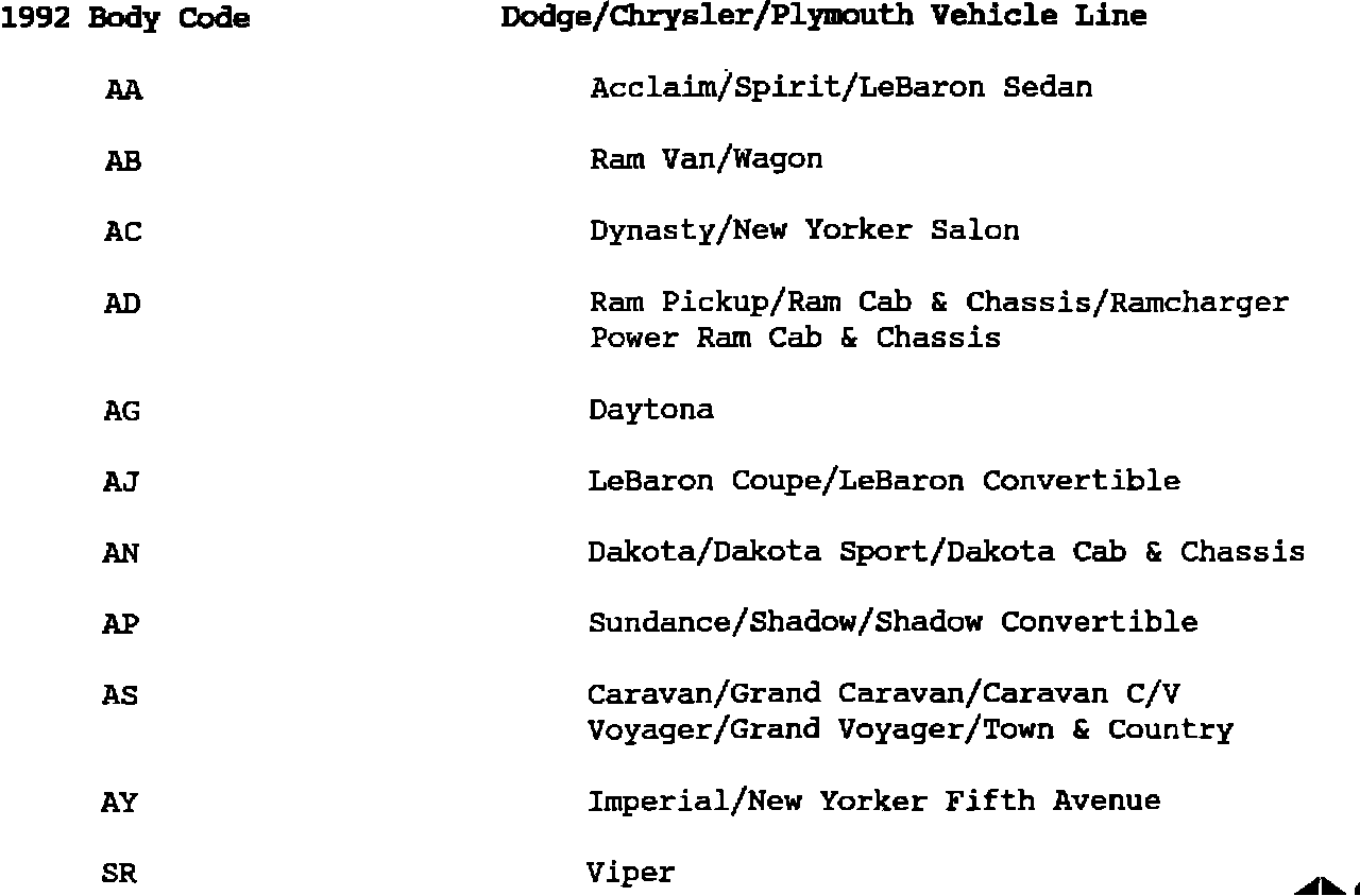 All vehicles in the 1992 Chrysler Motors line-up have been assigned a two-character body code, (example: AA - Body) instead of the model name, (example: Spirit). Using body codes in the Technical Service Bulletins helps clarify which vehicles are being addressed in the bulletin.