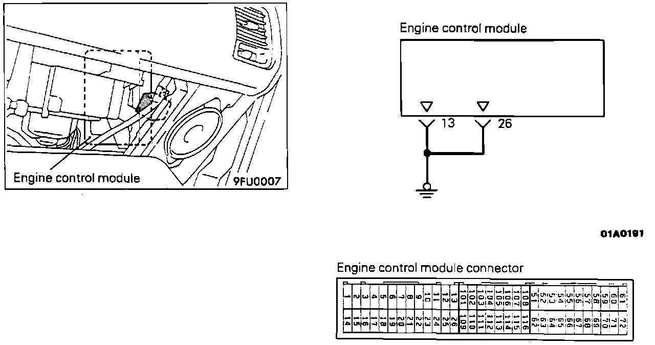 3. Using an ohm meter, check for continuity between ECU harness terminal 26 and ground.