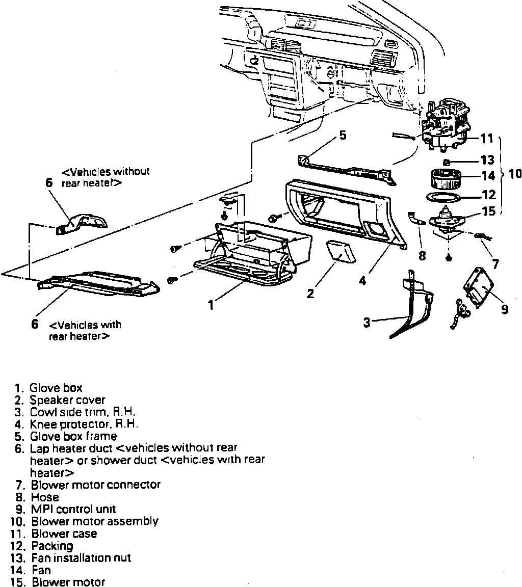 3. Remove glove box frame, then the lap heater duct on models without rear heater or shower duct on models with rear heater.